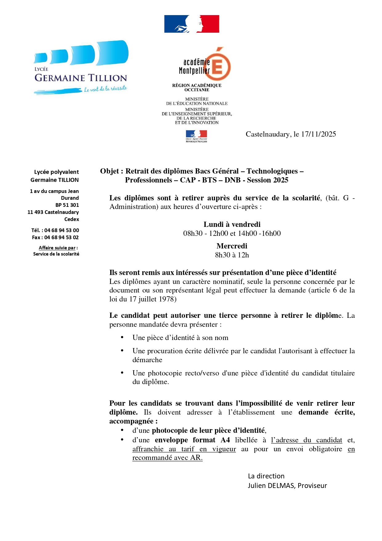 Retrait des diplômes Session 2025