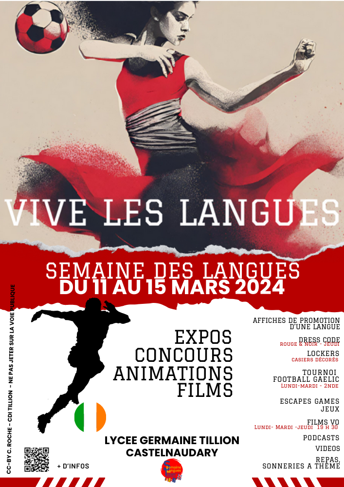 Cette année la semaine des langues aura lieu du 11 au 15 mars au Lycée Germaine Tillion. À cette occasion, des menus venus d’ailleurs seront à l’honneur, les murs du lycée accueilleront des cartoons sur le thème du sport, le CDI sera le théâtre d’escape games et autres rencontres littéraires, vous apprendrez les règles du football gaélique en EPS, les jeux prendront la part belle en cours de langues, des concours vous seront proposés. Les internes ne seront pas en reste, avec des projections en anglais, en espagnol et en allemand. De quoi contenter vos papilles, vos oreilles et vos yeux.
